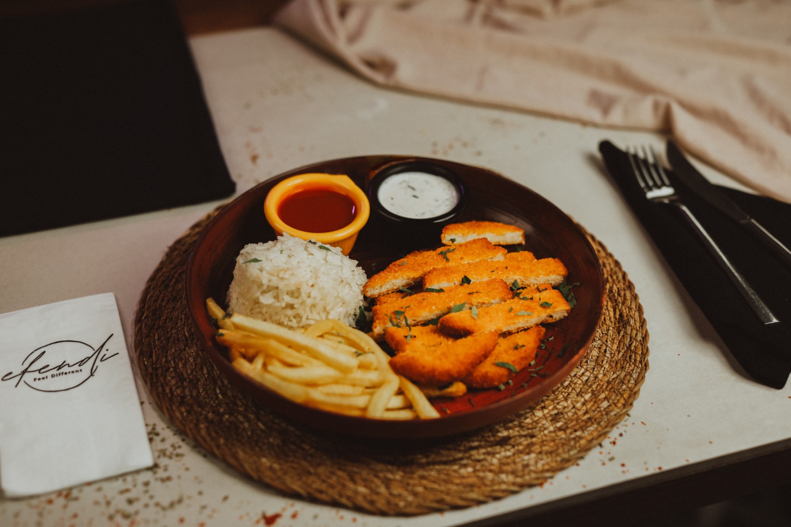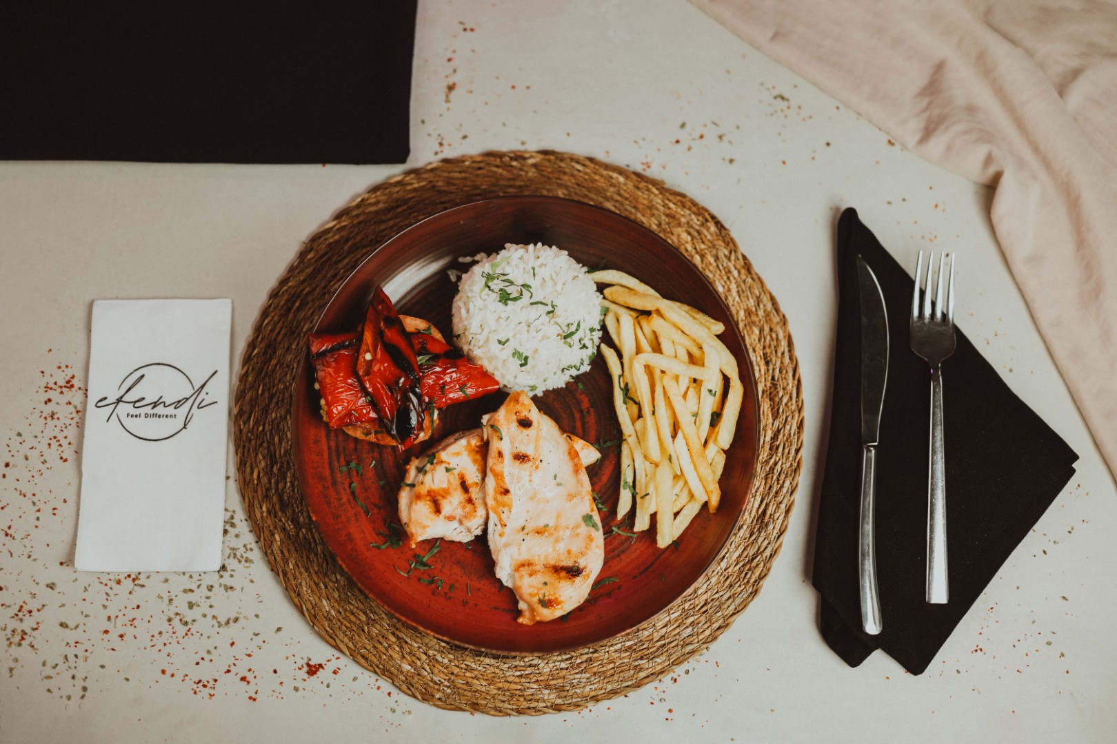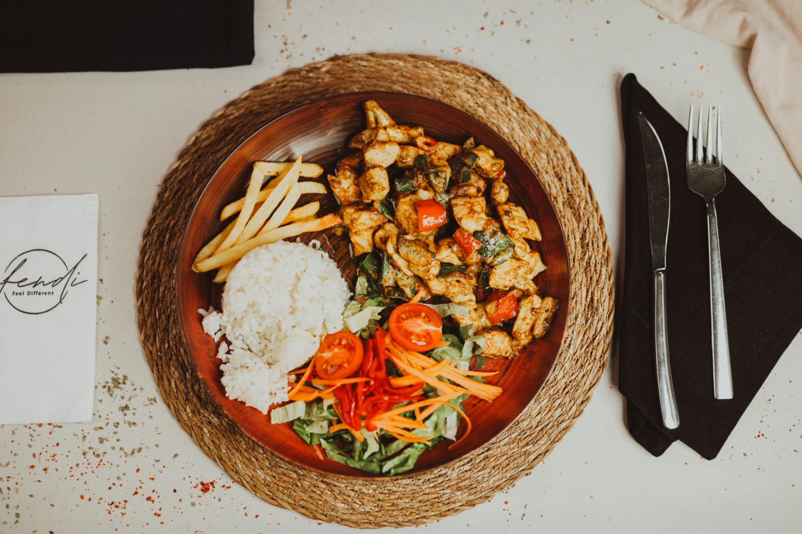 Tavuk göğsü, pilav ve sebze sote ile.